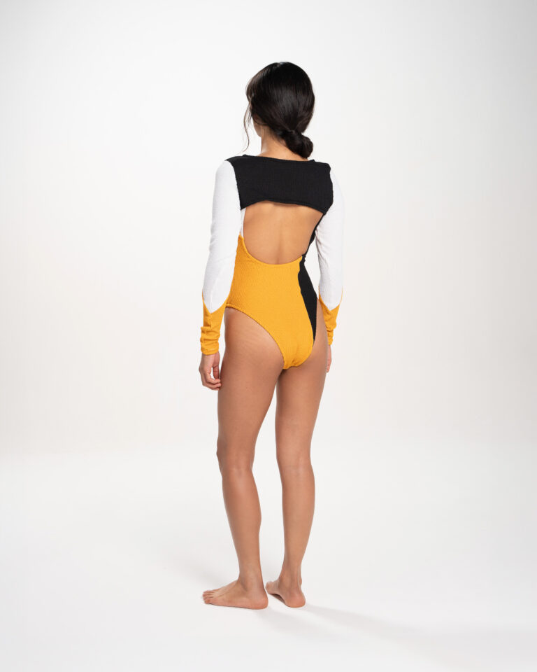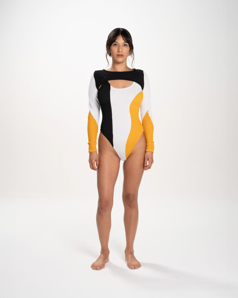 The asymmetrical cut not only catches the eye, but also highlights your body shape with a comfortable and secure fit. The shades of black and amber along with white create a bold contrast that enhances your presence.