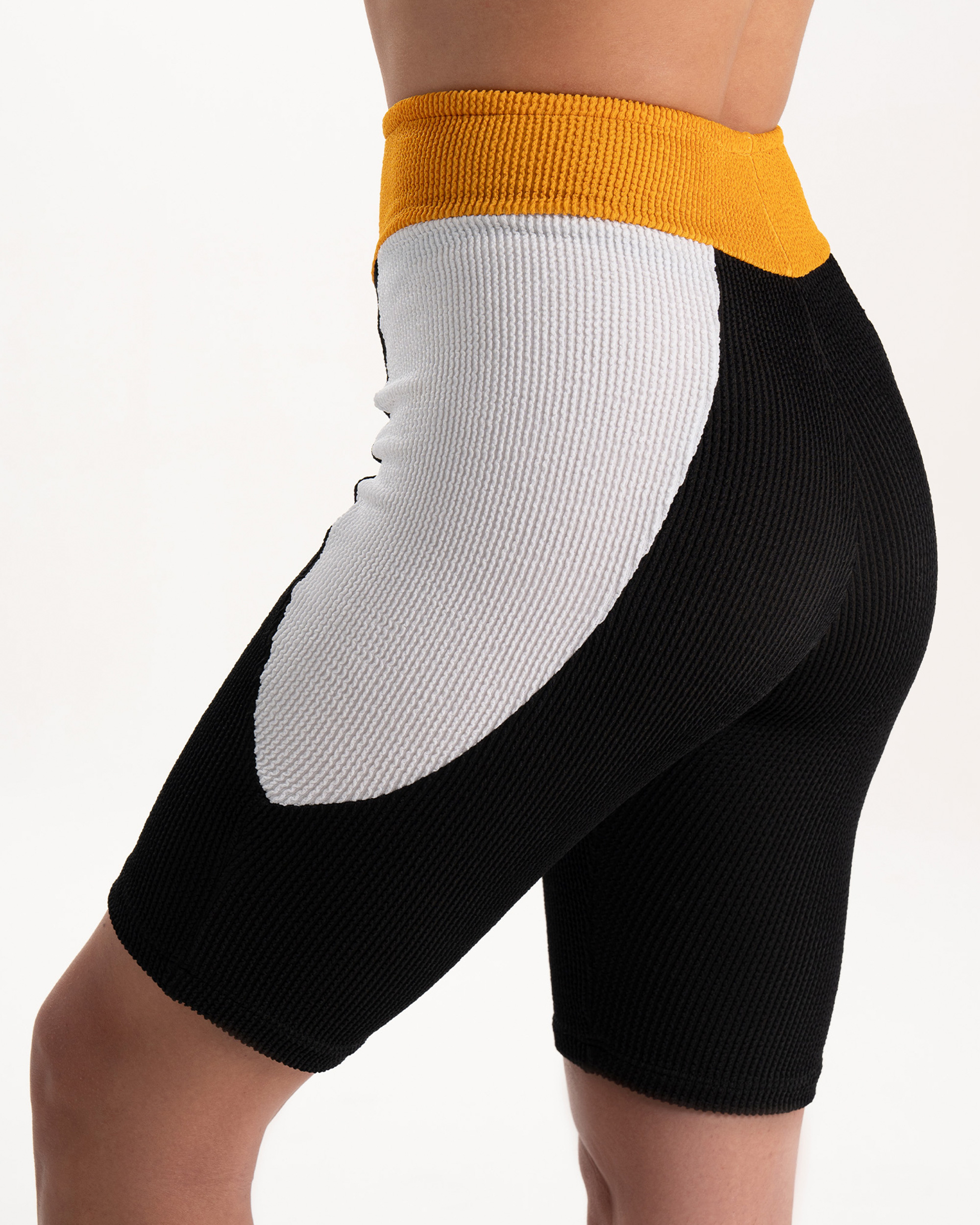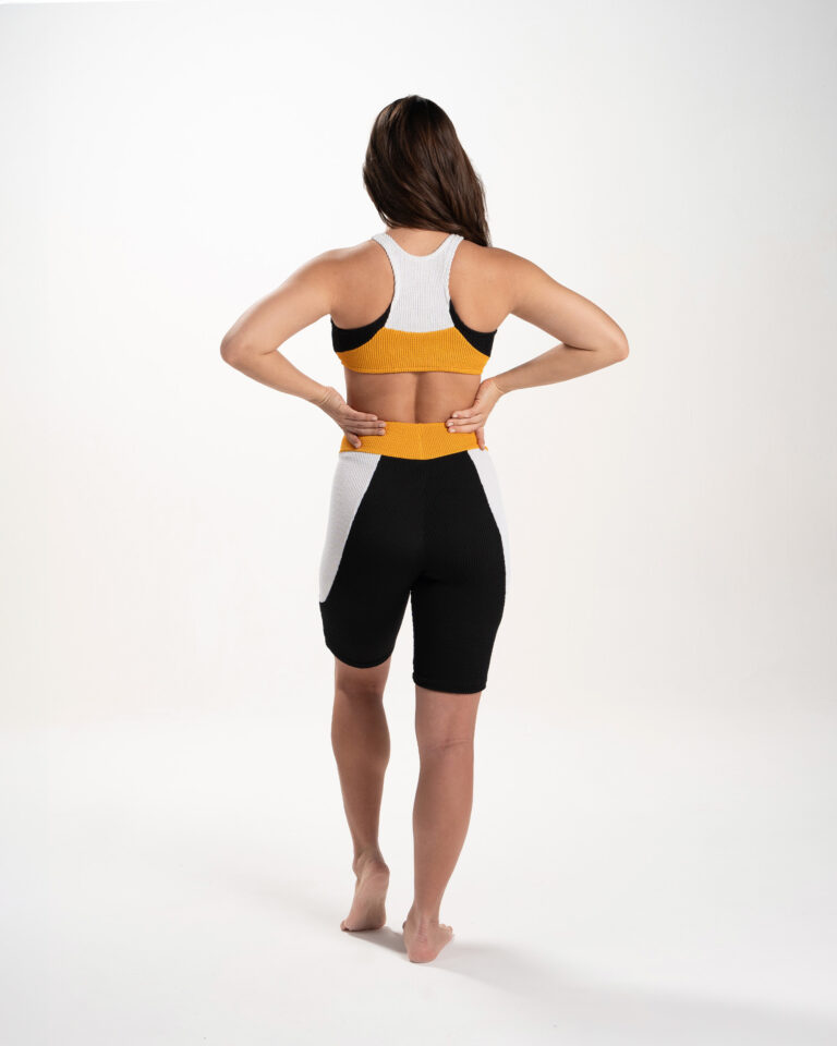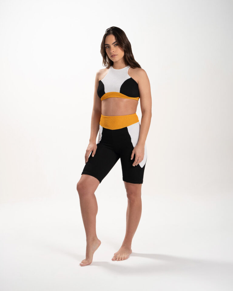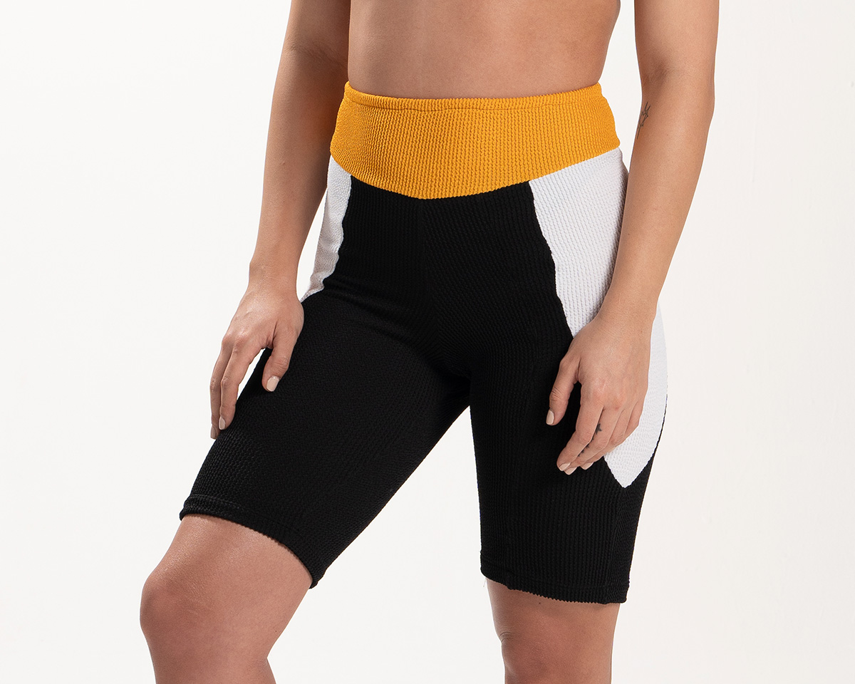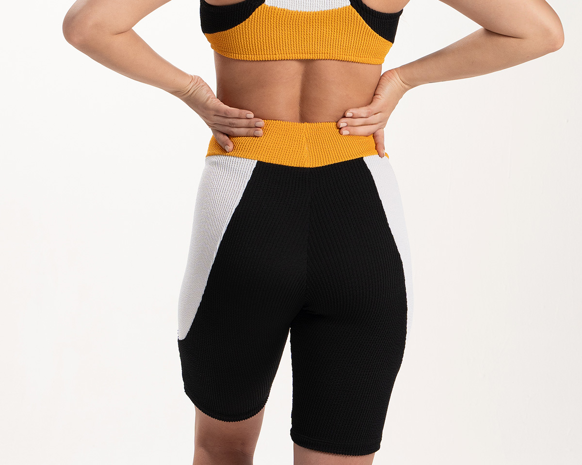 Pazo, sporty meets chic with our biker-style shorts in a bold combination of black, white, and yellow. Perfect fit for sports and effortlessly cool for everyday wear, they elevate any outfit.